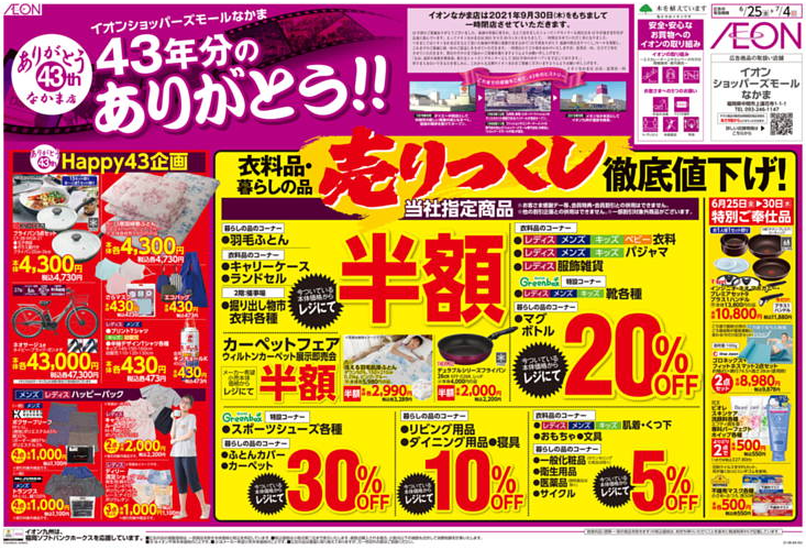 イオンなかま店の閉店セールは、6月26日(金)から開催されています。閉店日の9月30日(木)まで実施されていると予想されます。